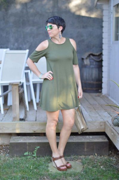I reckon this khaki cut-out dress is a style (I guess you’d call it A-line) that suits a lot of women – with the exception of those with a much fuller bust than me as the neckline is a little high. But it’s perfect for those wanting to hide their mid section. It’s also very comfortable to wear and so easy to style. When it gets a little cooler, I reckon it’ll look fabulous with jeans too. You know how I love wearing dresses with jeans right (and again here)?