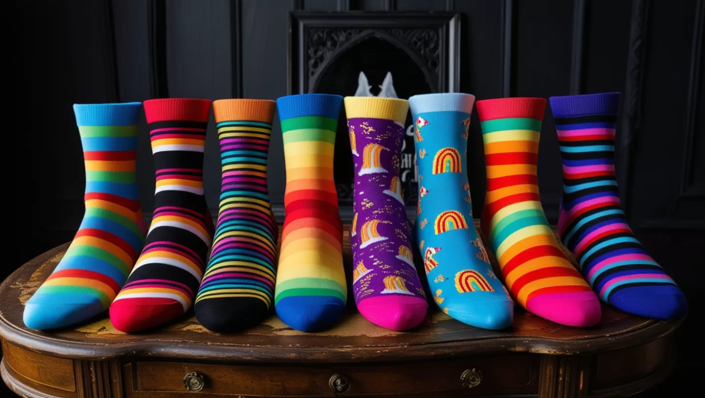 And of course, let’s not forget those fun, brightly coloured pairs that I can’t resist. I’ve always been drawn to bold designs—think rainbows, stripes, and quirky patterns. Even as I shift towards a more ethereal, gothic look, I still love adding a pop of colour to my outfits with a statement pair of socks. They’re a simple way to let my playful side shine through, no matter what style I’m rocking.