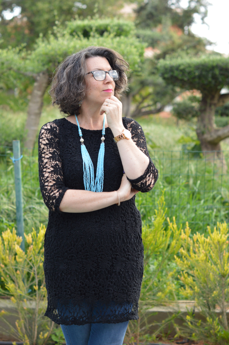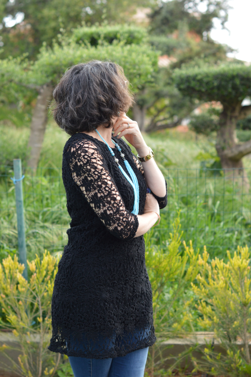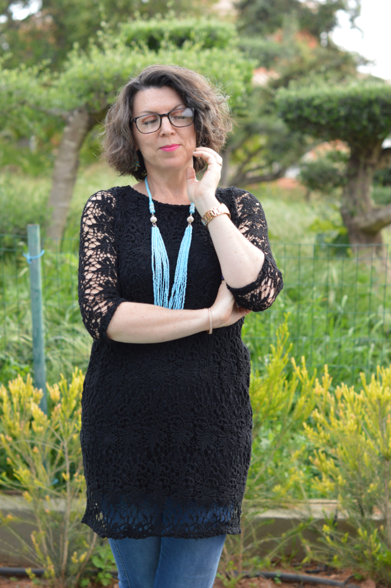 So here I am, a little bit dressed up, in an outfit I’ve kind of worn before. It’s a very old black crochet-style dress that I do believe I bought from eBay many moons ago. It’s one of those dresses that doesn’t get worn very often (for some reason), but I do like it! Here’s a super cute version with a lovely gathered shoulder detail and another by Desigual which is GORGEOUS! My favourite way of wearing it is with jeans of course (I’m nothing if not predictable sometimes lol). So on this occasion (Indian food with hubby, cooked by hubby and eaten in the comfort of our own home on Saturday night, I might add), I wore the black crochet dress with my Tiffosi jeggings and my favourite black ankle boots from Calla (THE most comfy shoes for bunions EVER).