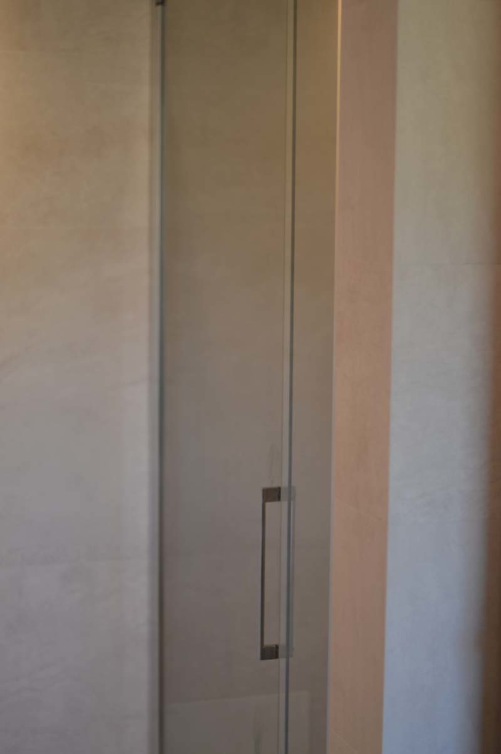 The first thing we chose for the bathroom were these beautiful off-white sand-effect tiles (they give the effect of fingers having brushed through sand). We opted for the back wall to be completely covered with them, which we highlighted with a few well-positioned spotlights from above.