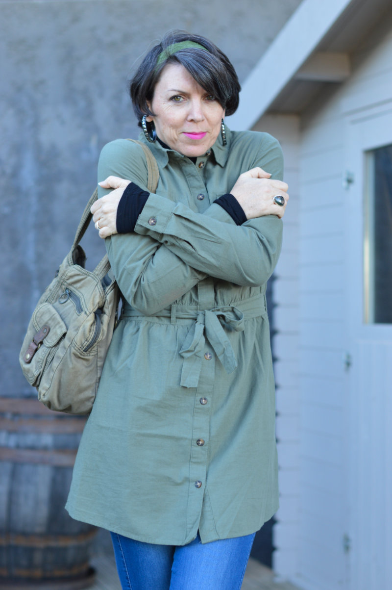 The first look is this khaki dress that I bought a few months ago when the Fab40s theme called for us gals to wear a shirt dress. I bought two dresses at the time but was saving this one for the cooler weather. Unfortunately, it’s been so cold that I needed to team it with a black polo neck and jeans lol.