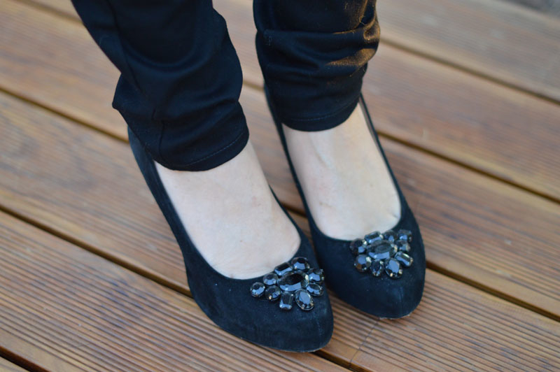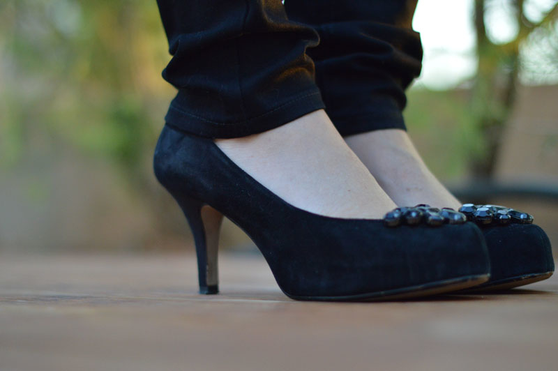 I also wore my favourite pair of black heels, bought from Clarks a few years ago. They’re super comfortable and so pretty. Don’t you agree? And I think they go really well with the black skinny jeans.