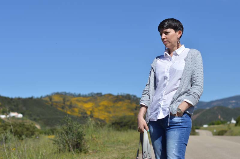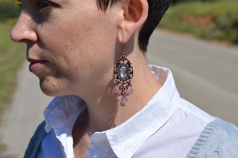 As for the rest of the outfit, I finally got my crisp white Massimo Dutti shirt out of the wardrobe – it’s one I’ve hardly ever worn on account of the fact that it is crisp and not very soft (find a similar one here). Surprisingly, I soon realised it didn’t matter, it was still comfy! My girlie grey cardigan from H&M went perfectly with it, then I added something I’ve been dying to wear but haven’t found the right outfit for them yet. These gorgeous rose gold ornate dangly ear-rings. I do love to add something totally dressy to a more casual outfit – I think it adds not only a dash of glamour, but also fun! My Marta Ponti (Portuguese designer) handbag finished off the outfit.