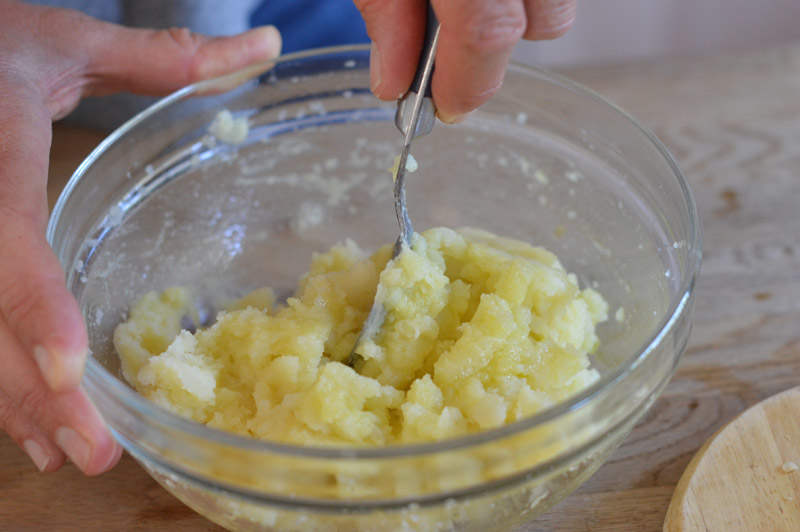 Mix the potatoes and a generous amount of olive oil until soft, then add the remaining ingredients, keeping a little cheese for the top.