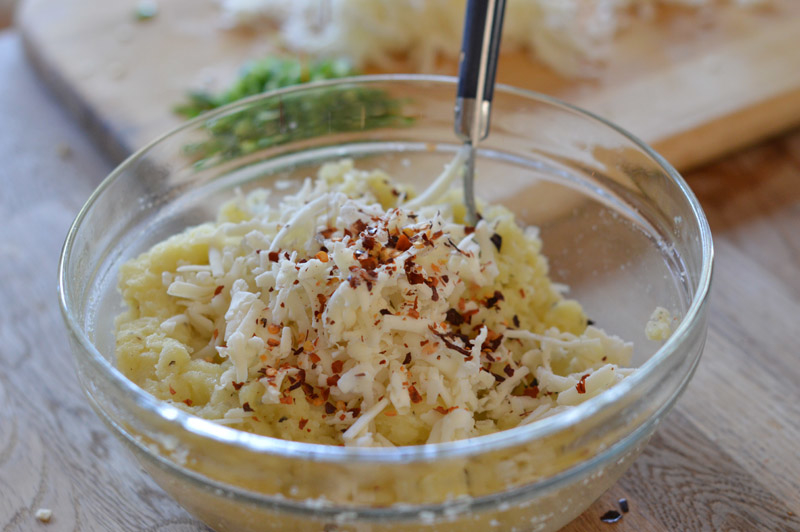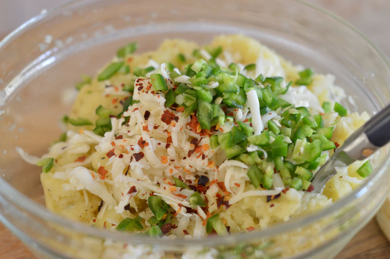 Bake the potatoes in the oven until done (at least an hour – but it depends on the size of potatoes), then remove and cut them in half. Scoop out the insides and place into a large mixing bowl before putting the potato skins back into the oven.