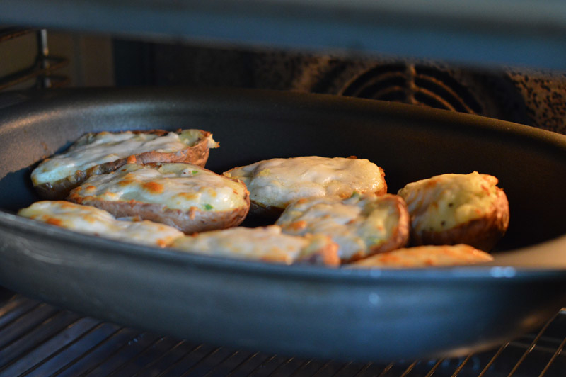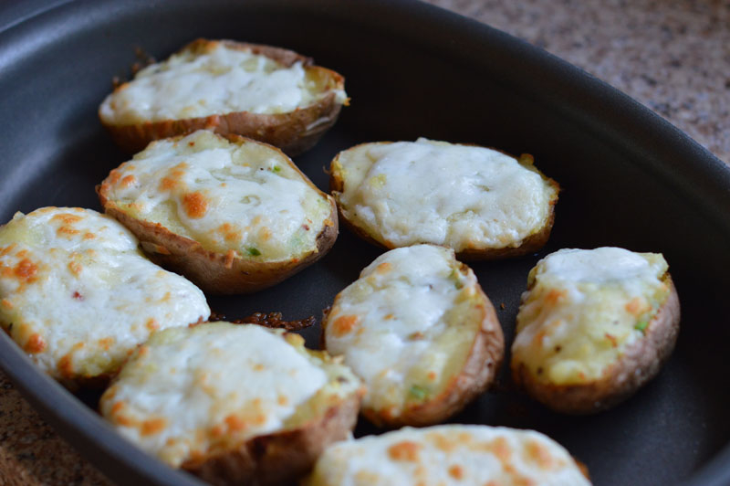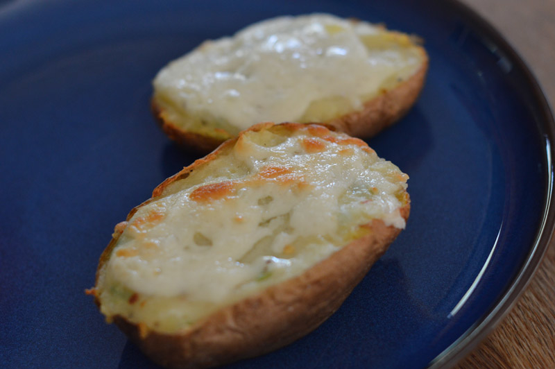 Remove the potato skins from the oven and spoon the potato mixture back into each half. Sprinkle with the remaining cheese and place back in the oven. Bake for a further 15-20 minutes, or until the cheese on top starts to golden. Remove from the oven and serve with a generous green salad. YUMMY!