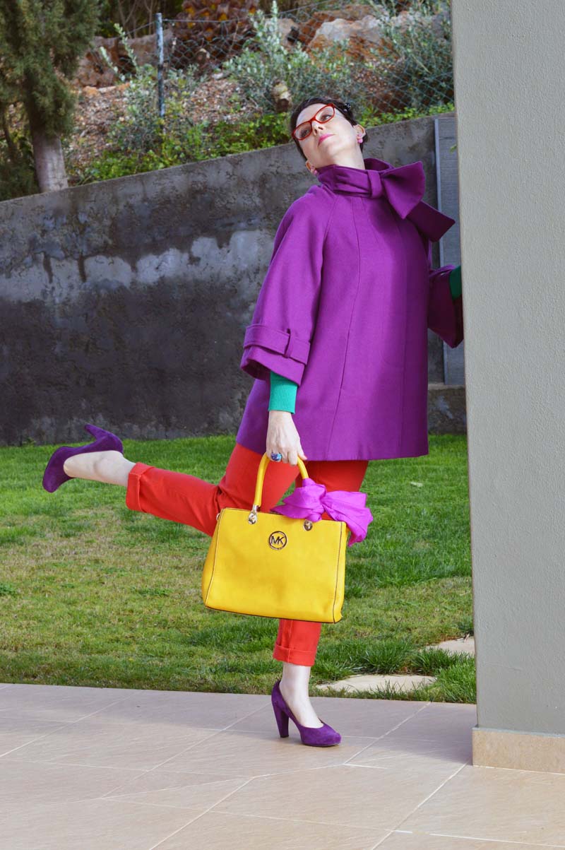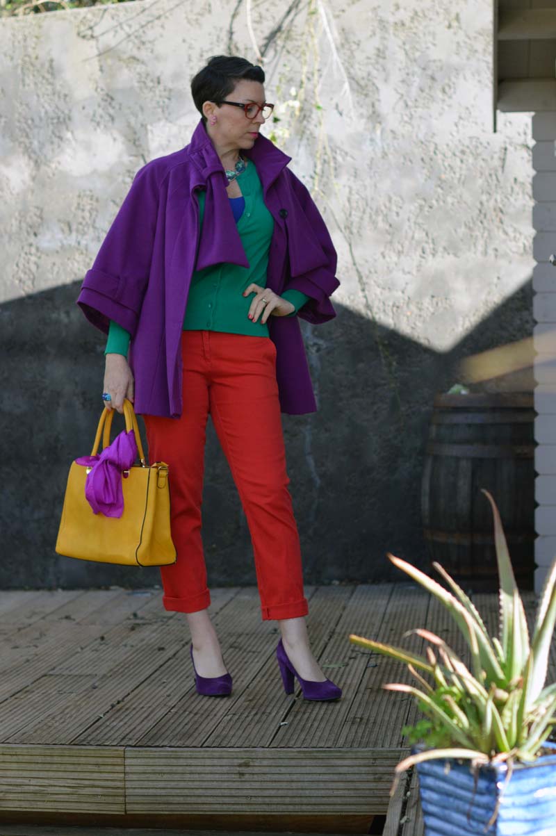 This month’s FAB 40s theme of ‘colours of the rainbow’ was the most fun I’ve had blogging so far! I pondered over the course of several weeks, about what I would wear. The only thing I knew I wanted to include was this purple coat (which was a gift from my mother-in-law a few years ago). I also knew I wanted to incorporate as many colours of the rainbow as possible.