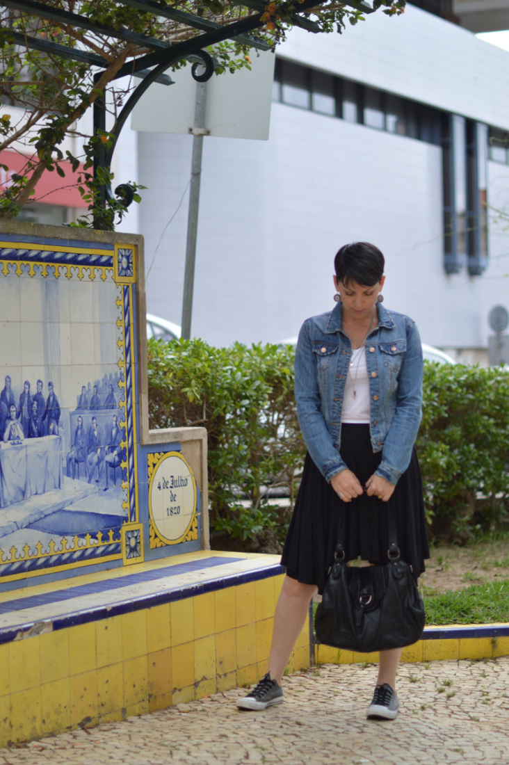 Converse: Schuh Blue Denim Jacket: House of Fraser White Denim Jacket: Boden Black Skirt: House of Fraser Black handbag: House of Fraser