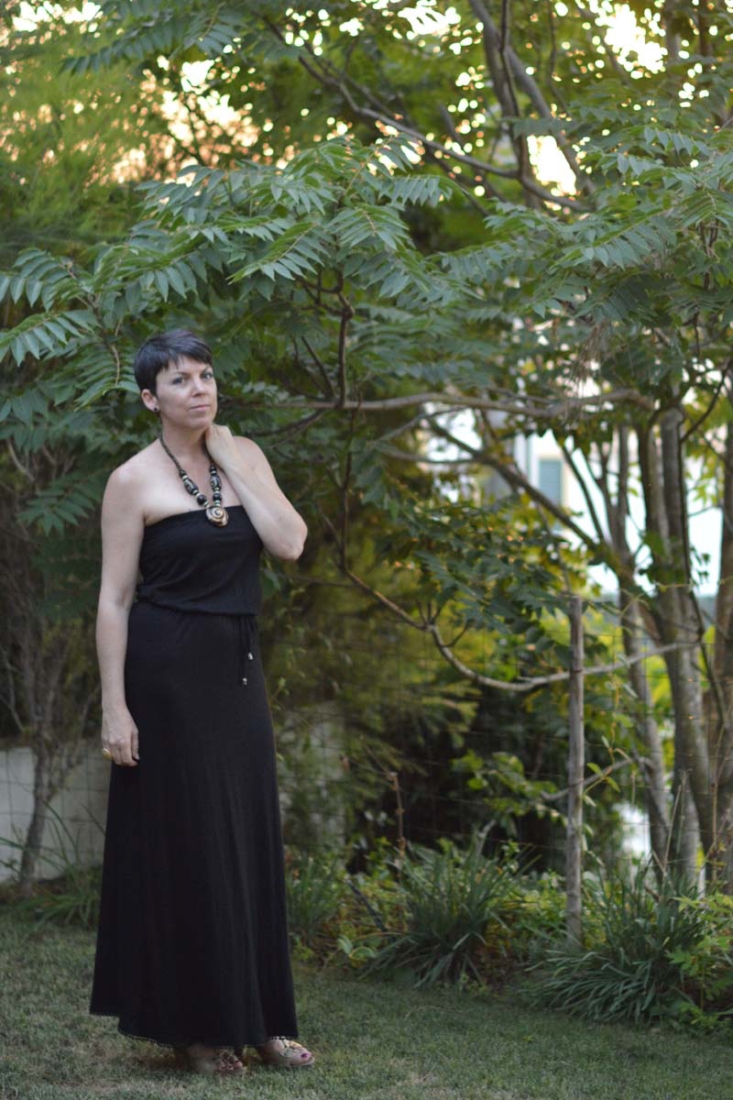 Firstly, the long black bandeau strapless dress (£14) was worn with a pair of strappy Replay nude heels, a chunky necklace and simple black ear-rings. The dress is incredibly comfortable. It’s soft fabric does hug my curves but I wasn’t too self-conscious because of the elasticated belted waist, allowing the top part to drape over the top.
