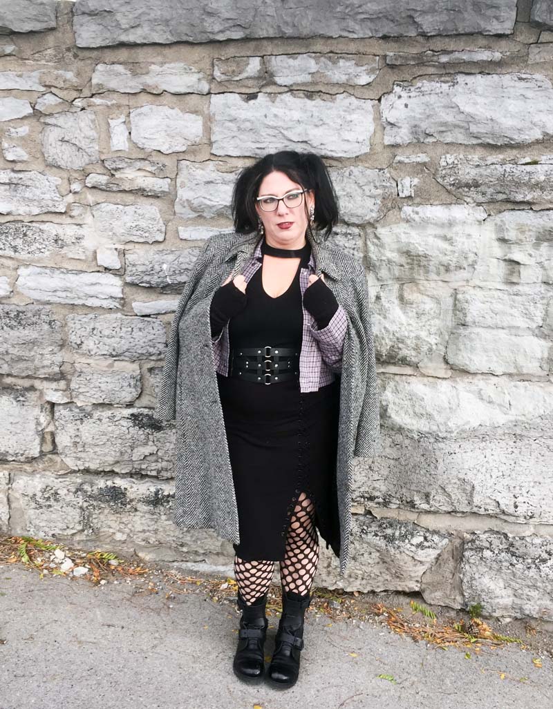 When I chose this month’s theme, I knew that Shelbee would absolutely rock it. I think she’s a bit of a closet goth too. It’s like this theme was made for her. I mean, just look at those tights!! The boots! The belt! The dress! The coat! All of it – she looks absolutely fabulous!