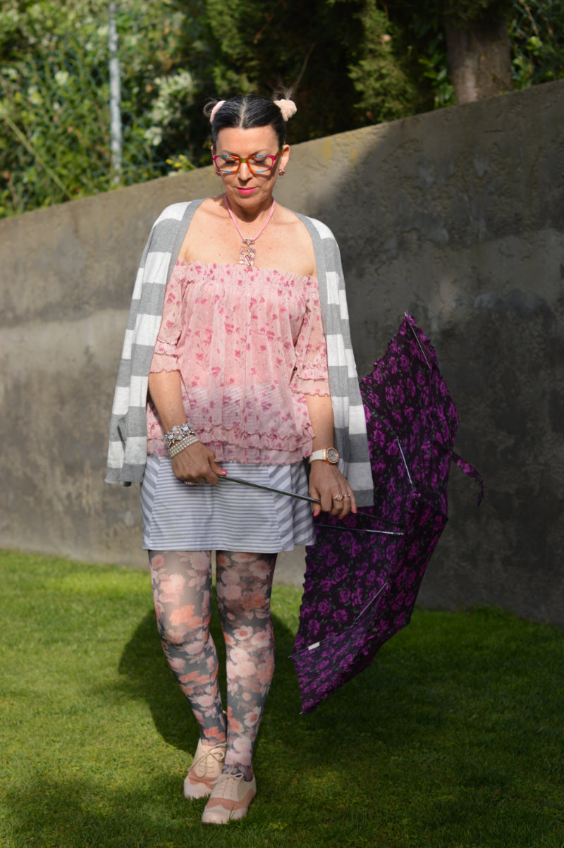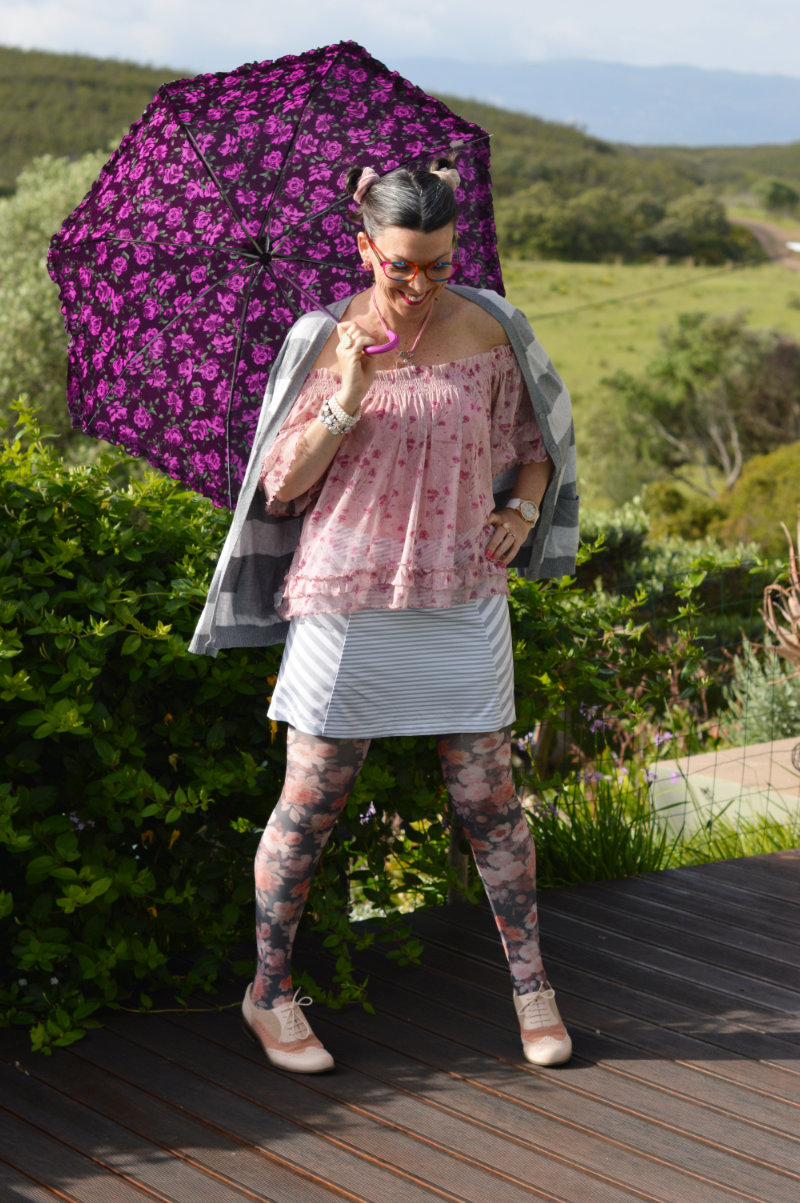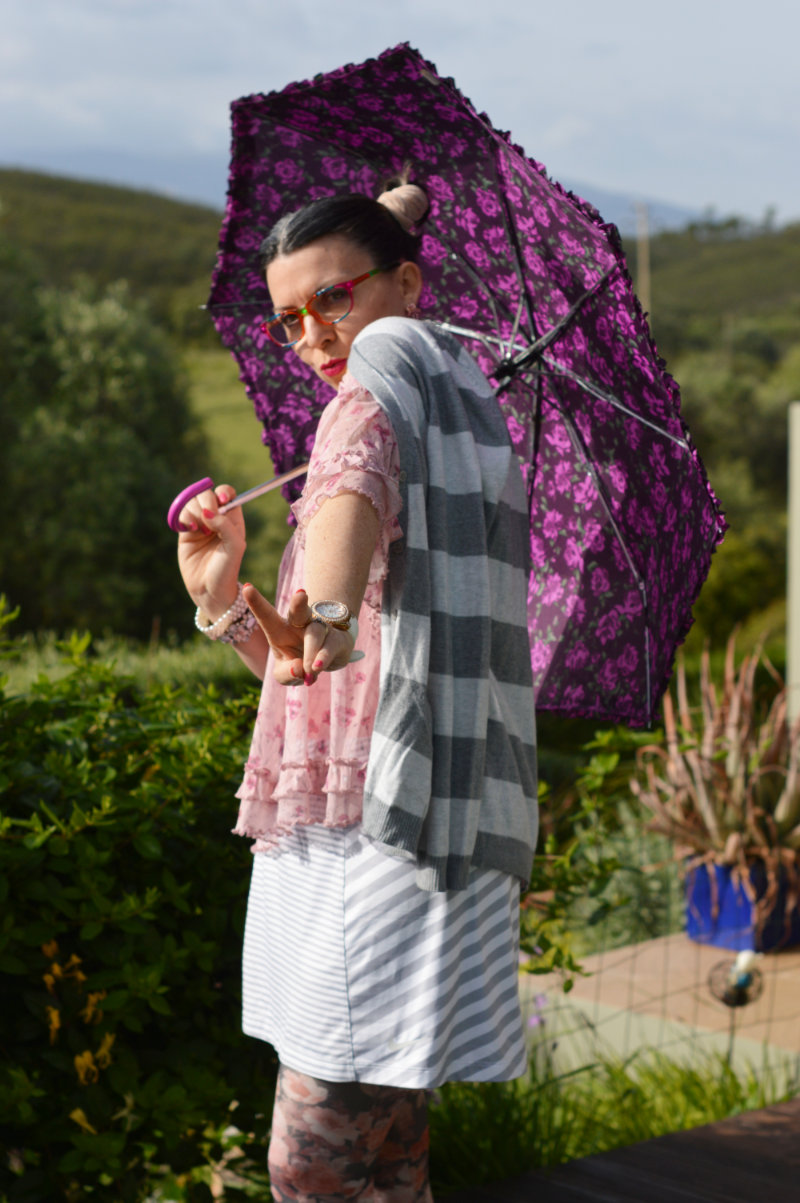 No surprise here that every single piece of jewellery I’m wearing (apart from my engagement and wedding rings) were gifts from my mother-in-law lol. I figured with Harajuku style, the more the merrier, right? And to top it all off, I added a purple floral umbrella.