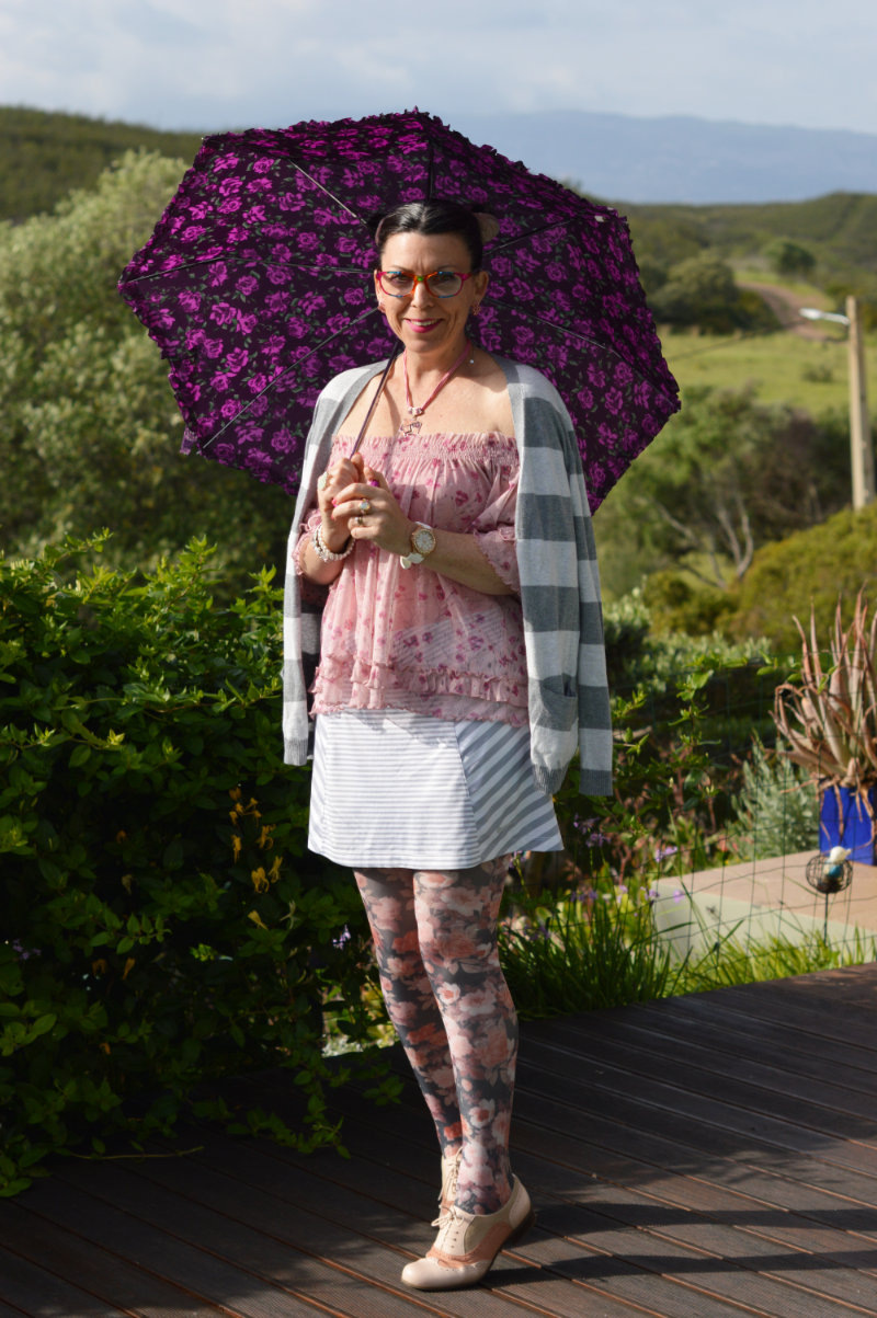 My first choice was floral tights, white shorts, white shirt with a crazy bright neon orange tank top over the top of the shirt. But it wasn’t quite right. Perhaps because I felt like I needed more prints to mix and match, real Harajuku style. So I tried again and the next outfit felt right–if not completely alien at the same time. But I stuck with it and piled on the accessories and then revealed myself to hubby…