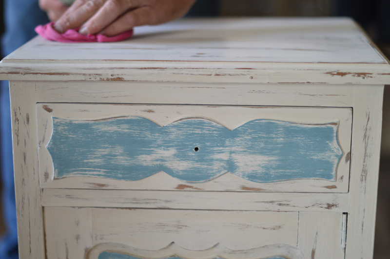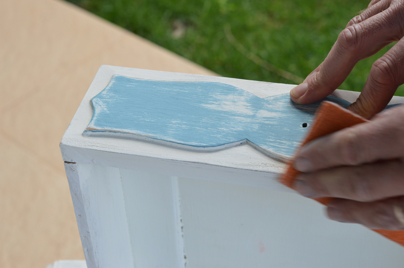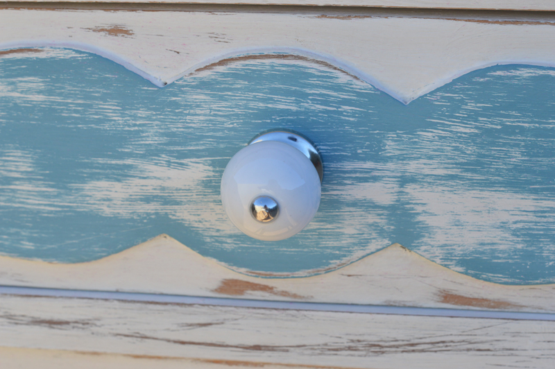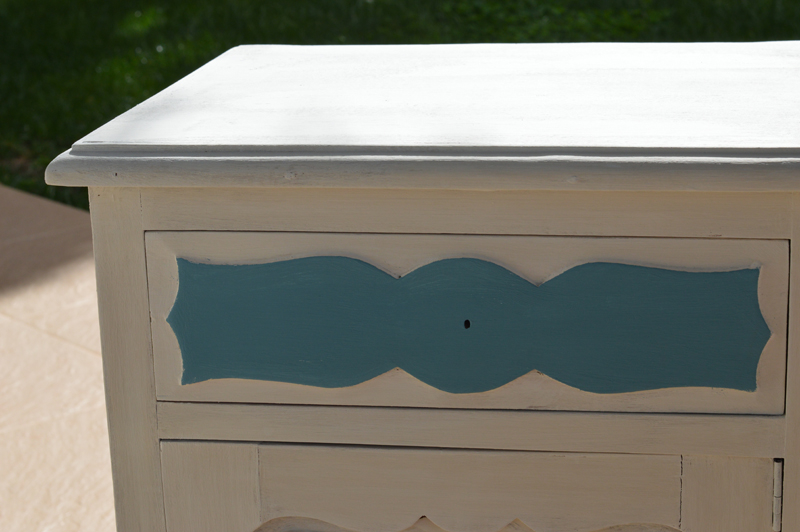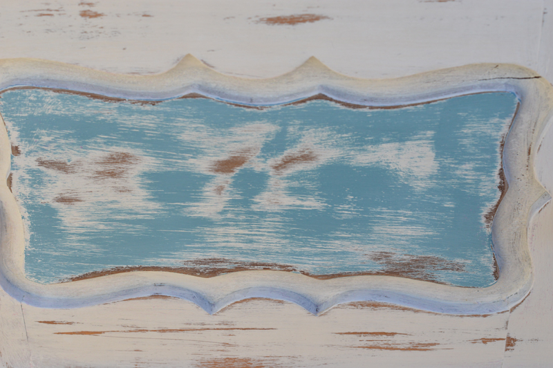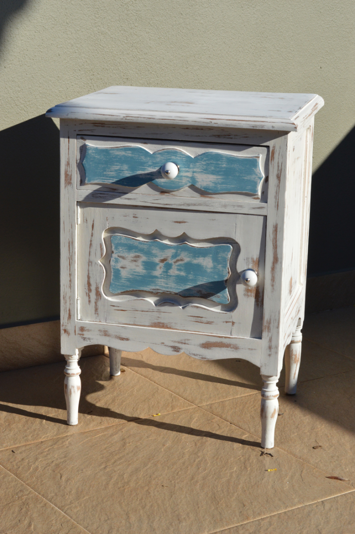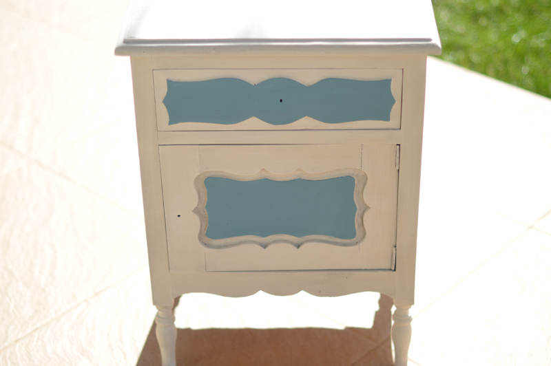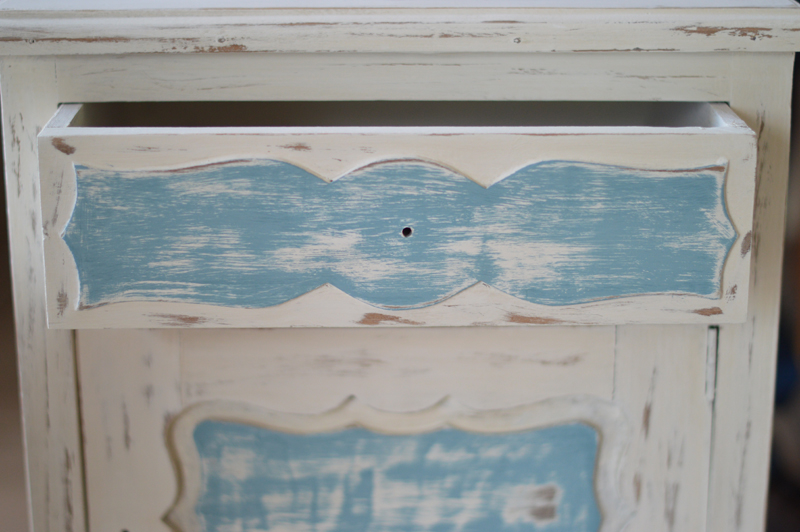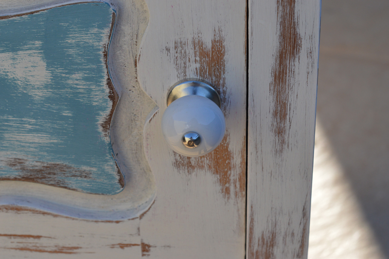 It’s a very simple procedure, all we did was clean the bedside table, making sure there was no dust/dirt left on it, then lightly rubbed it down with sandpaper (actually, this wasn’t entirely necessary but hubby felt the need to do it at this stage), before painting it with a couple of coats of the white paint (over the course of two days), then we painted the front decorative sections in the blue paint. The following day when the paint was completely dry, we then used sandpaper to gently rub any areas to give this distressed look. I think it worked remarkably well.