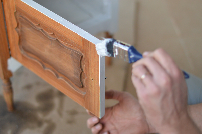 We found some white and blue paint from Leroy Merlin which worked well but we’ve since discovered another shop which sells the even better Annie Sloan products. If you Google Annie Sloan, you’ll see that her stuff is THE stuff to use when distressing furniture. But for these tables, we used the Leroy Merlin products.