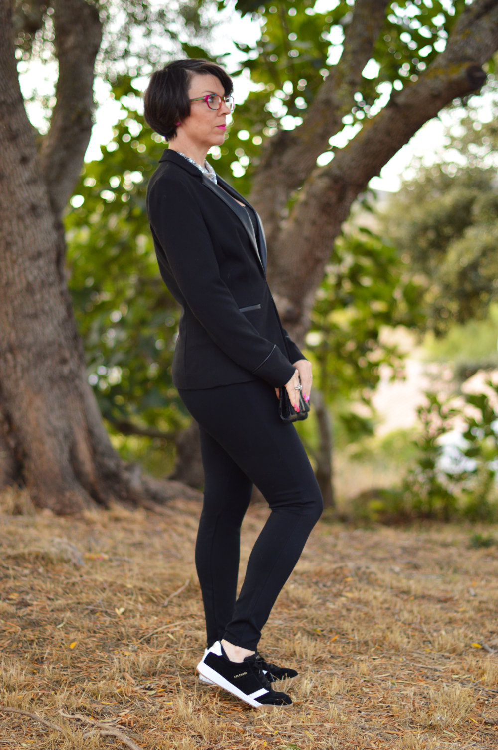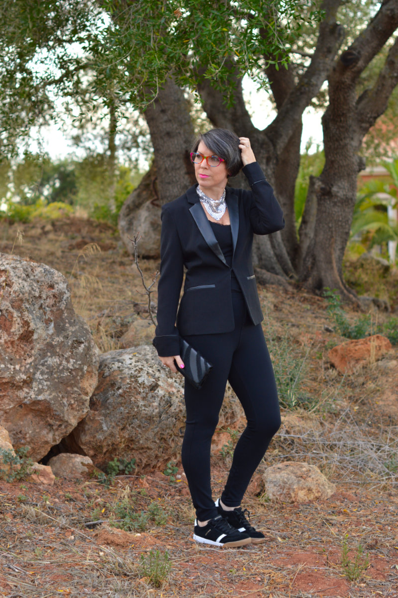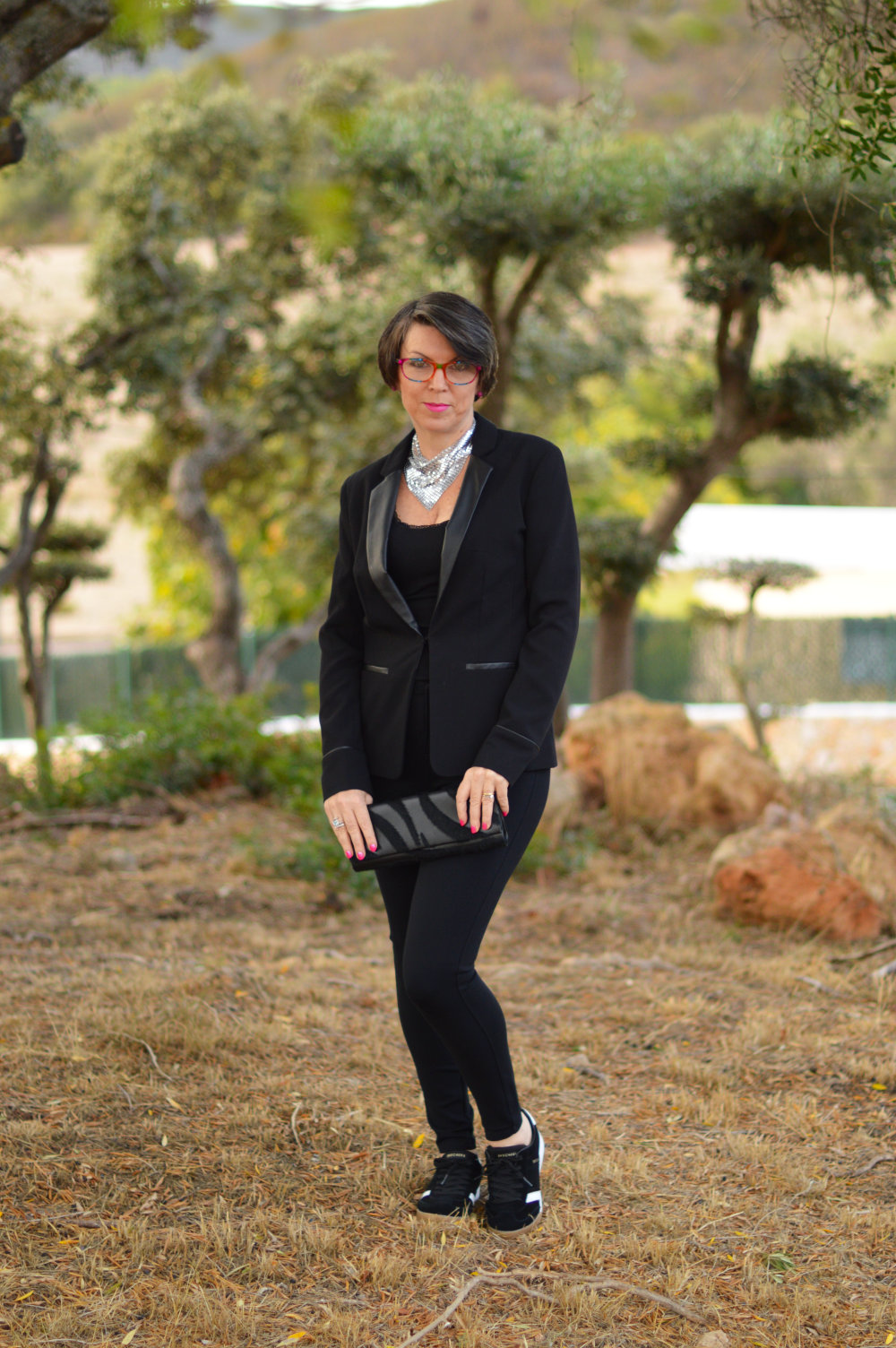 As for footwear, I could have gone down the dressy route, but no. I wanted to showcase how great trainers can look with a dressy outfit. And don’t they look great? They’re the same as my red Skechers (which I’ve worn loads already). The only difference is that they’re all suede instead of leather. I absolutely love them and think they look super cool with this necklace-inspired outfit. The black clutch and stunning silver ring were inherited from my late step-mother-in-law, by the way.