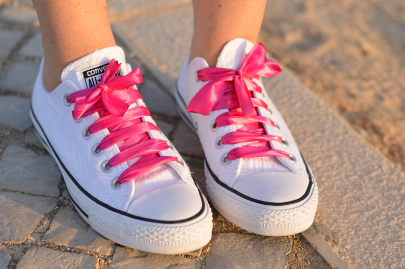 Actually, first of all I laced up my glittery gold Vans with them, which looked pretty cool. Unfortunately, my Vans are a bit on the snug side and in this heat it was just too much. So, I decided to add the pink ribbons to my white Converse All Stars instead. I must admit, I do love the result. It’s bright, fun and girlie too!
