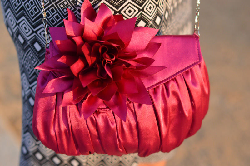 Some fun bright pink earrings (I can’t remember where I bought them from), and a super cute little girlie handbag which was a gift from my mother-in-law a few Christmases ago. The colour matches perfectly with the ribbon 🙂
