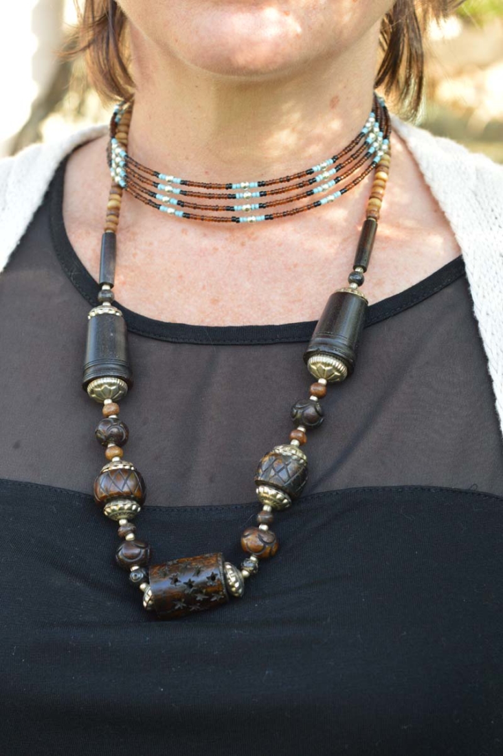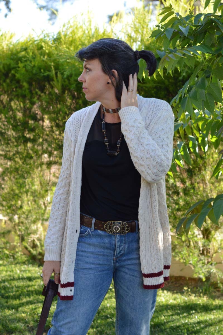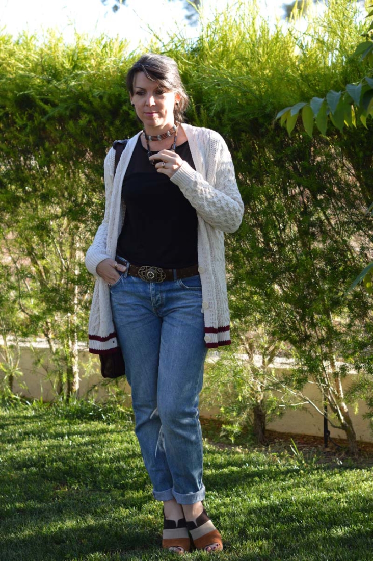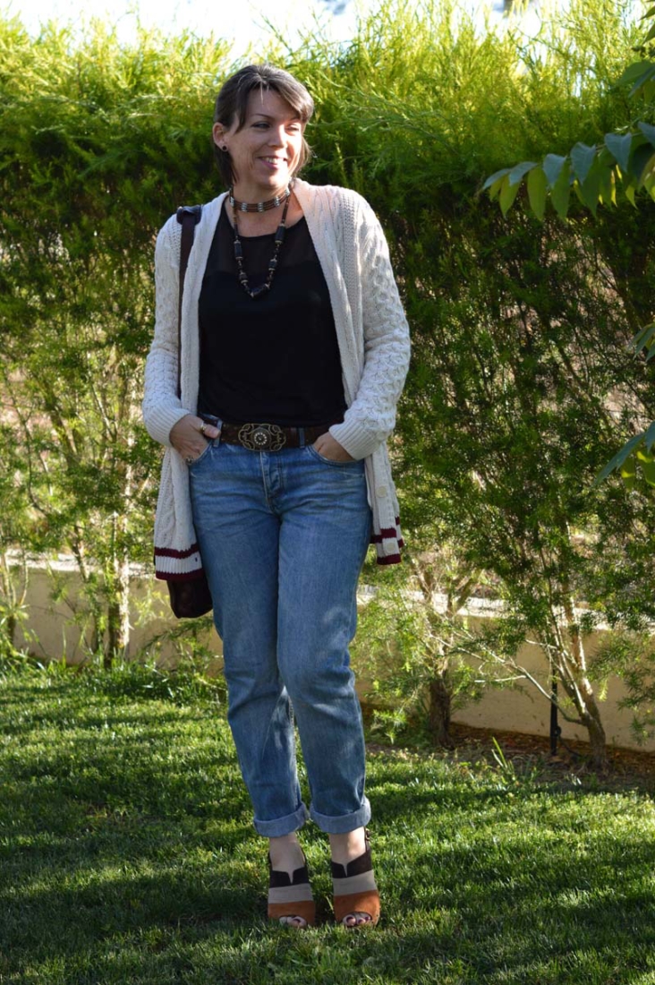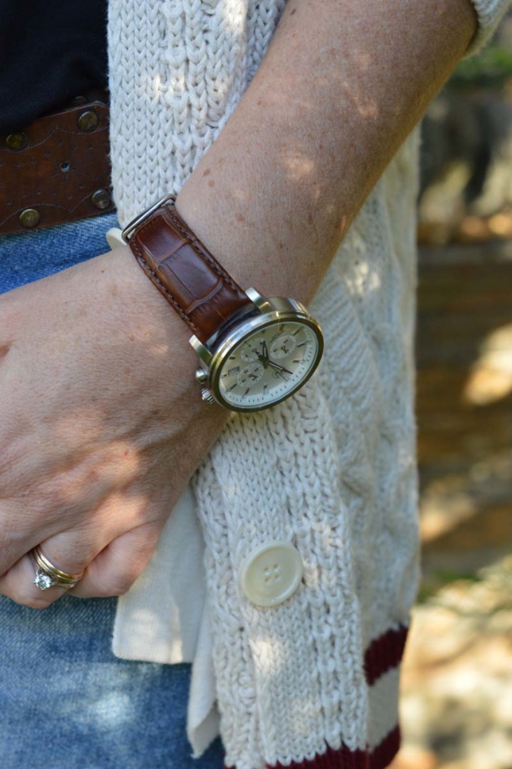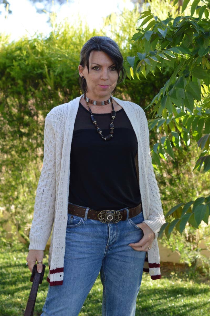 I couldn’t make up my mind which necklace to wear, so I figured I’d wear them both. Why not? The choker is a particular favourite that I wear a lot throughout the summer. It has a native American vibe that I’m a fan of. I pinched another of my hubby’s watches – this one is by BMW (surprisingly) and then I threw on my woolly cricket cardigan for some added warmth.
