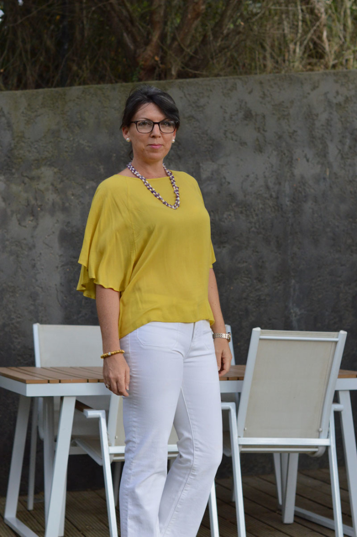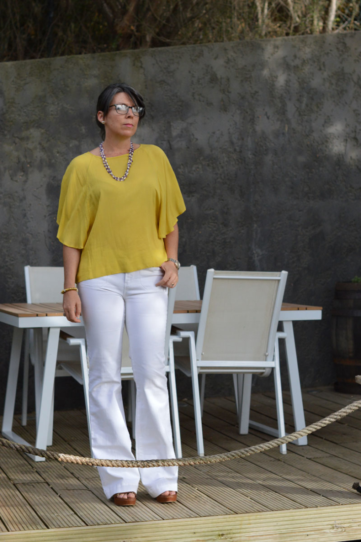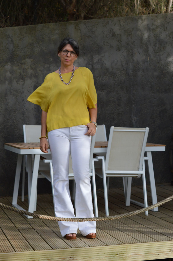 I wouldn’t normally wear a loose fitting top with flared jeans but on this occasion, when I added this thin mustard yellow blouse, it just seemed to work. I tried tucking it in as well but preferred the floatiness of the loose fabric – it also meant I could tuck into the cheesecake I made for dessert ;).