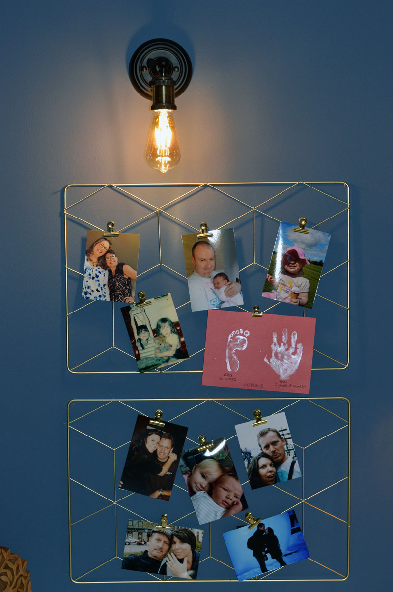 I really liked the idea of having gold as an accent colour but as yet I haven’t got an awful lot of that in there – apart from a few little things like these wire frames and sparkly gold/white cushion, both from Primark. I also knitted some curtain tie backs using a thick gold thread that I found in my local Chinese shop. Not to mention these fabulous stag heads I spotted in Zara Home – I figured they’d be great to hold the tie backs. And check out these amazing curtain pole finials which are actually Christmas baubles that we adapted! Cool, huh?