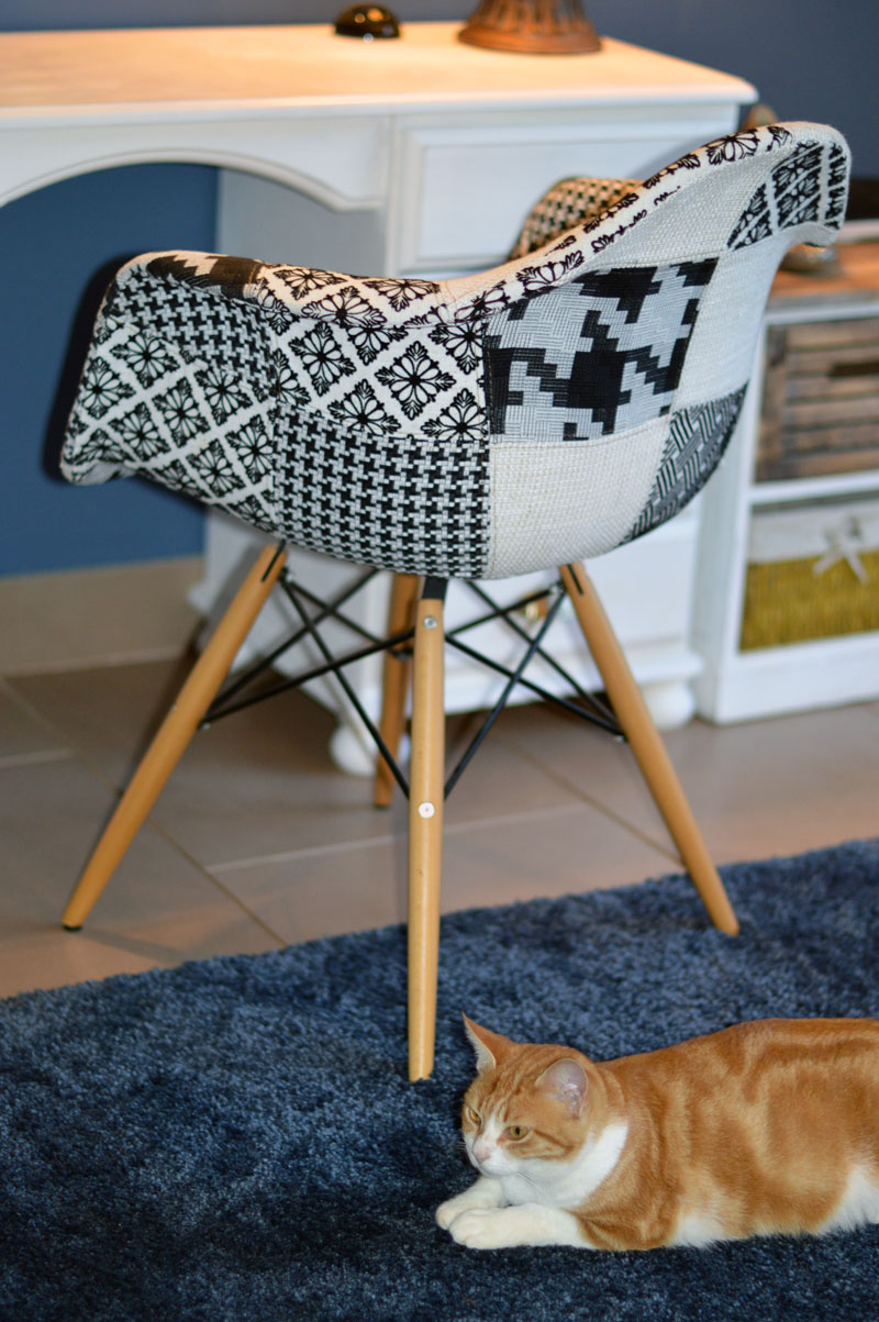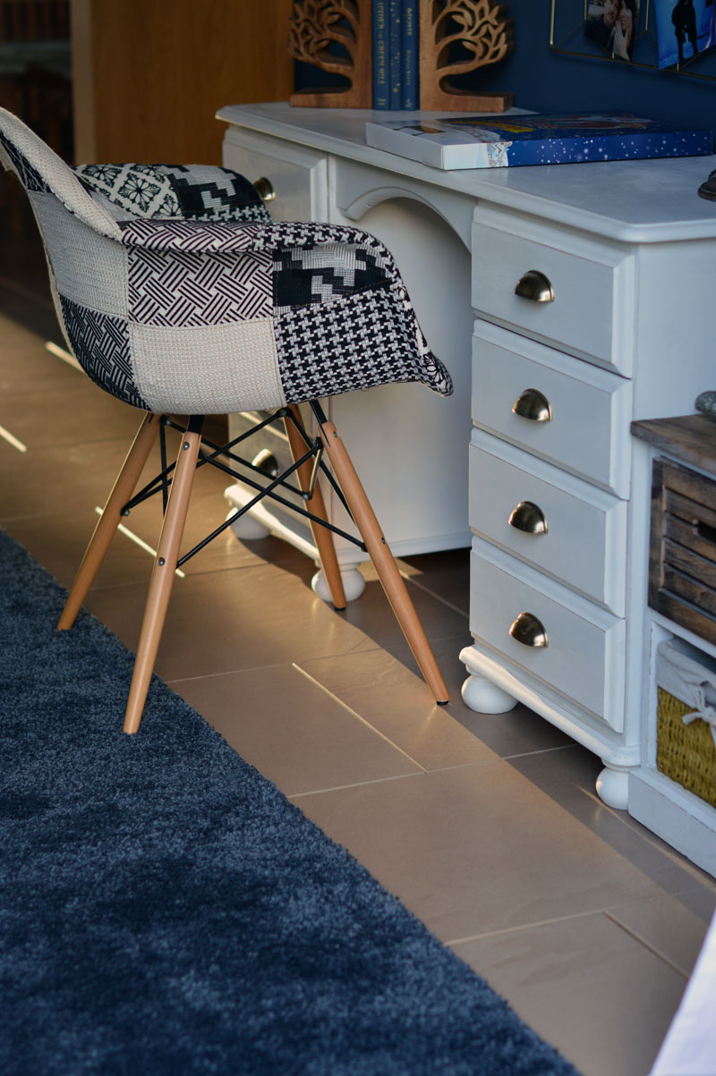 Before we started, I knew I wanted a darker colour on the walls. And because we have green everywhere else, I opted for a lovely shade of blue. We kept the ceiling white to really make the room pop, we bought a soft dark blue rug from Ikea to match, and used a dark blue armchair we already had (also from Ikea). Simple white curtains were chosen to break up the dark blue and I must say I’m absolutely delighted with the way my new office looks.