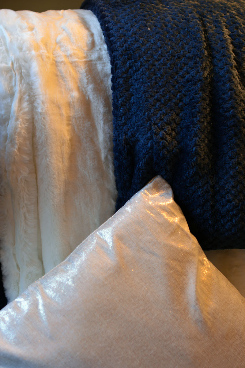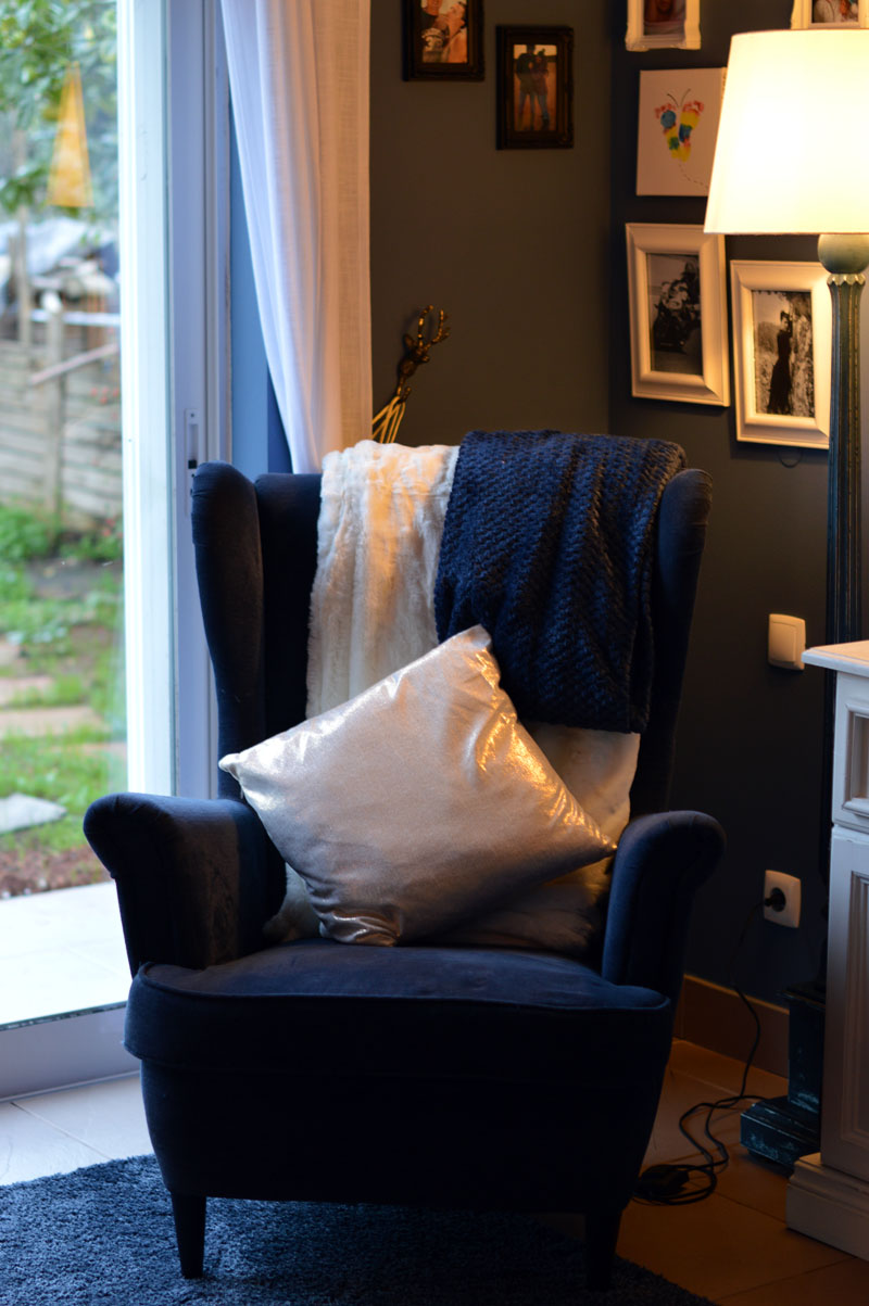 As for the blue chair, we’ve had it a few years and I thought it would be perfect in this room. I’ve thrown a beautiful white fluffy blanket (a gift from another dear friend) on the back. As well as a blue fleece throw from Primark for when I get really cold.