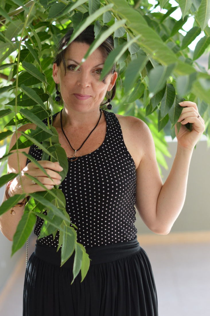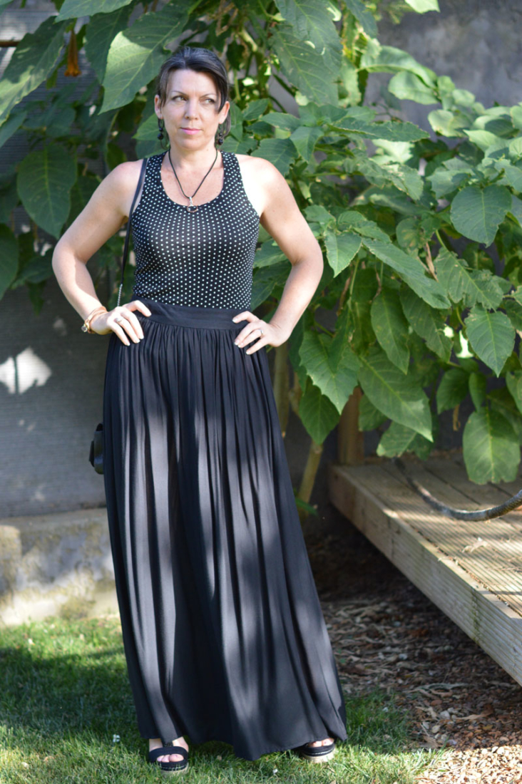 A couple of nights ago, we went out for a meal with friends to our local restaurant and it was still super hot in the evening. I struggled to find something to wear so I ended up with this long flowing skirt and a cute cotton vest top with polka dots on it. I think long flowing skirts are the ideal thing to wear when it’s hot. I’d have preferred one in a brighter colour but black is all I have. As I write, it’s sooooo hot here in the Algarve. At 9am this morning, it was around 30º already! Phew! I don’t cope so well in this heat, so I was cooped indoors with all the shutters down trying to keep it out. I can’t wait until the pool is built!