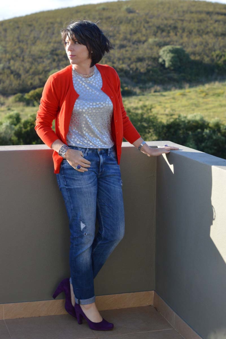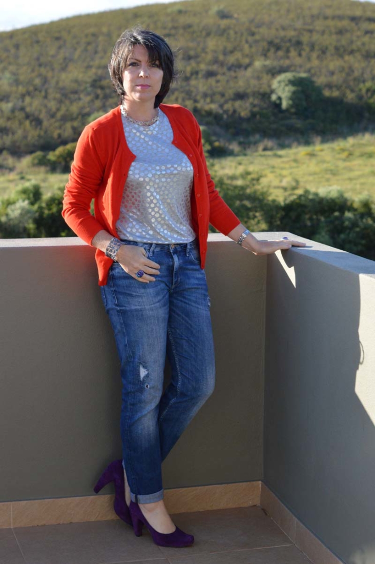 It was quite chilly over the weekend so a cardigan was a must. I figured a red one would be a nice contrast to the purple shoes. Again, this is from H&M (what a surprise!) and it gets a lot of wear (it’s been on the blog a lot lately). I do love the colour. And it goes really well with the silver tee.