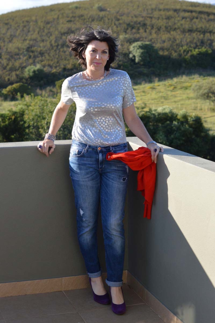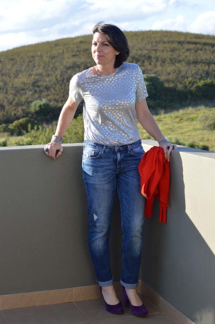 Whenever we have a pizza night, we eat A LOT of yummy homemade pizza so loose fitting jeans were a necessity. My H&M boyfriend jeans were the ideal pair, which I teamed with my uber gorgeous purple shoes. I just LOVE these shoes. I’ve had them years and they’re still as good as new. We found them in a shoe shop in Lagoa (Algarve) that closed down a few years ago. I also have a pair in grey which hubby bought as a gift for me (he’s such a sweetheart). For heels, they’re surprisingly very comfortable.