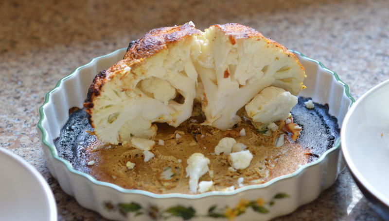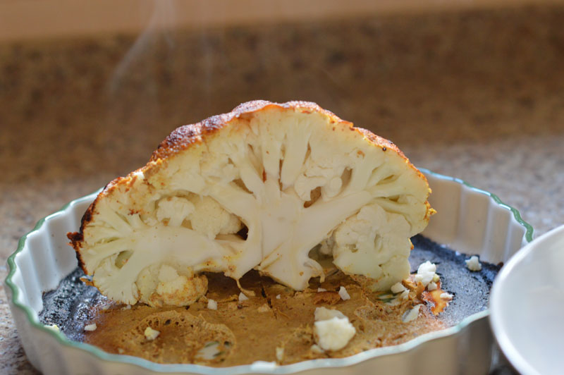 Preheat the oven to 150 (celsius). Lightly grease a baking dish (I used a small quiche dish) and place the whole cauliflower in the middle. Mix the remainder of the ingredients in a bowl and then smother the cauliflower in it – it’s easier (and really messy!) to use your hands. Roast in the oven until it’s dry and lightly browned. Probably around 40 to 60 minutes. Remove from the oven and leave to stand for 10 minutes before cutting into quarters. Et voila! Let me know if you do give this a try. I’d love to know how it turns out for you! 😀