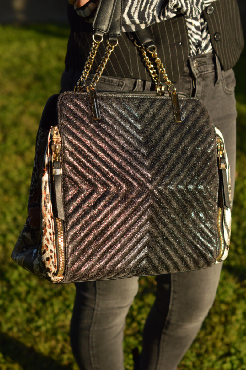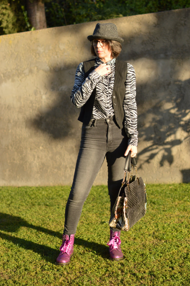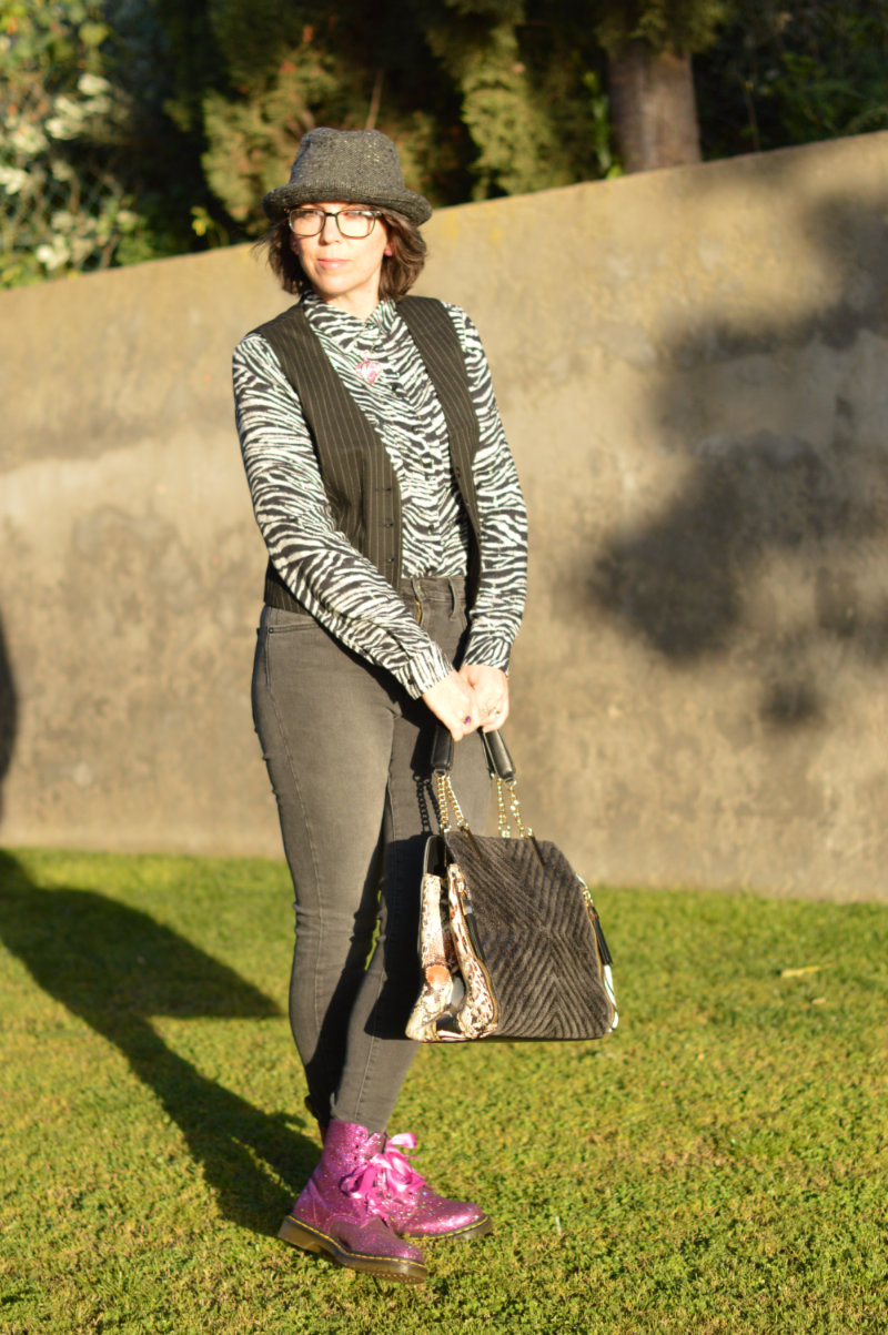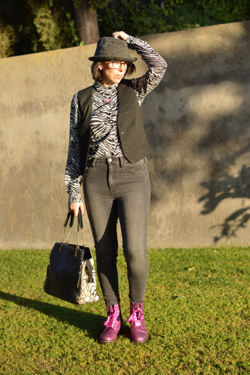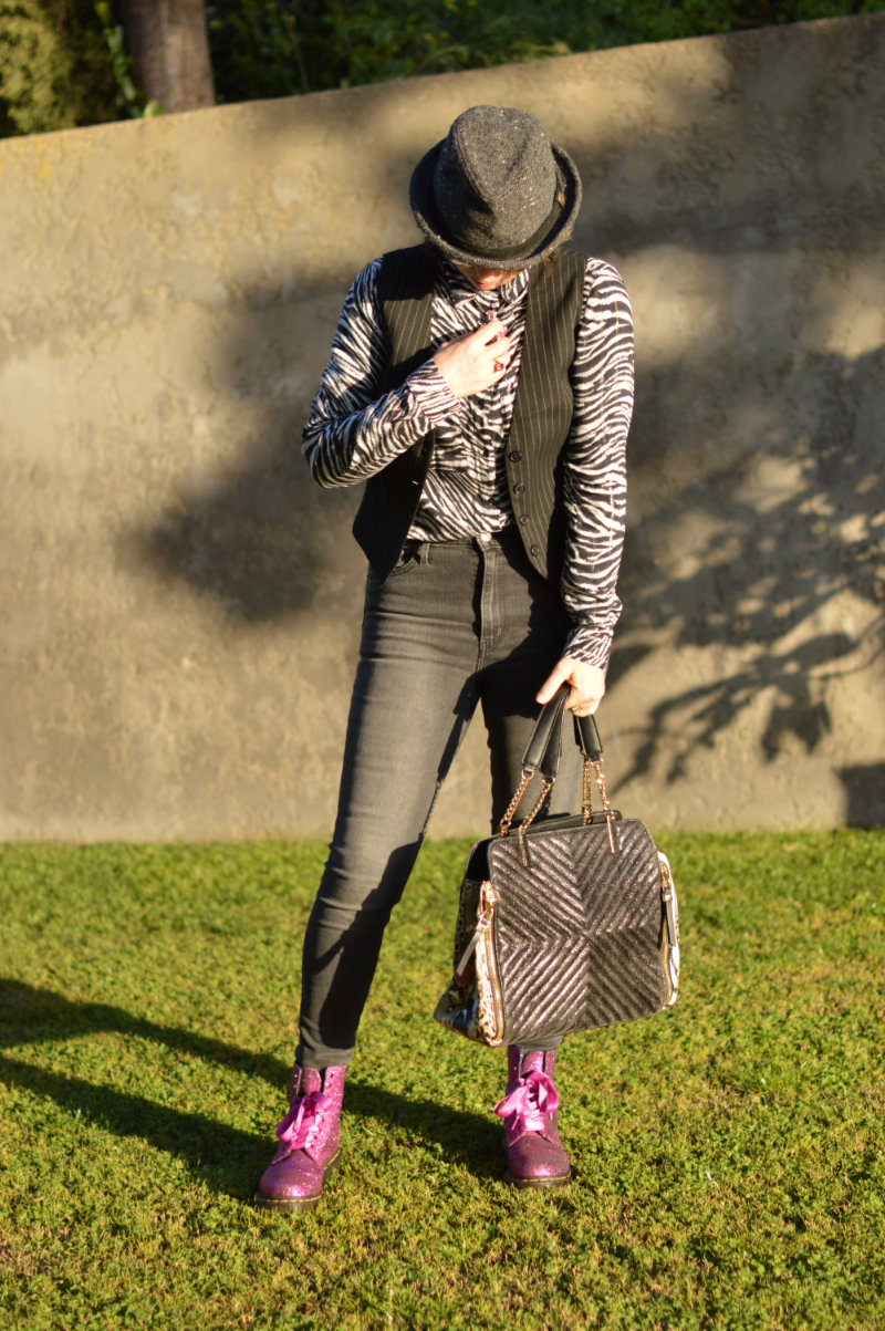 As for my outfit, I’m not much of a way out person when it comes to style so I went for something a little more, erm, normal (!). Skinny faded black/grey Levi’s, a zebra print shirt from Promod (similar here and here), a pinstripe waistcoat from Stradivarius (similar here), my incredible sparkly pink Doc Martens (find them here or another even more fabulous pair here) and a hat that I borrowed from hubby. I added a black/grey handbag with hints of animal print (another gift from mother-in-law) and a cute pink necklace (also a gift from mother-in-law lol). It’s perhaps not everyone’s idea of street style, but it’s mine. I could have added a massive coat resembling a duvet cover, and perhaps a pirate’s hat and then perhaps I would fit in with everyone else at Paris Fashion Week he he he (just kidding!) 😉