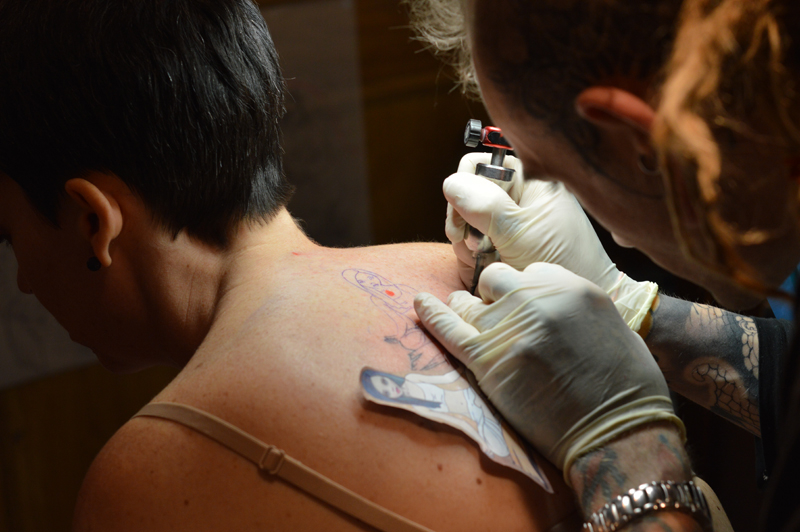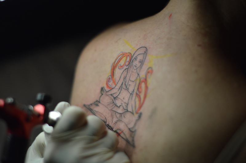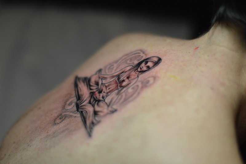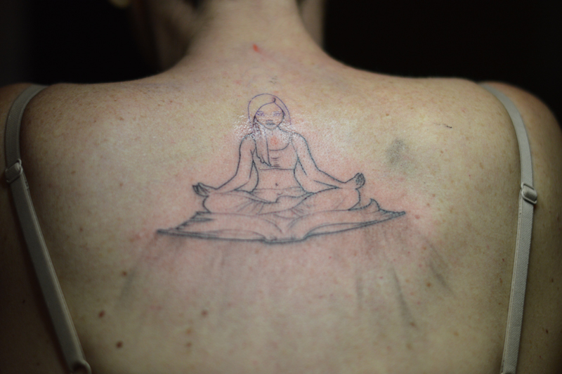Over the next few months, we emailed each other to discuss the design and placement of the tattoo. I sent him a few pictures giving him an idea of what I wanted – a gothic doll’s face, a woman sitting in lotus position and an open book. I wasn’t entirely sure where I wanted the tattoo though, as originally I’d wanted it at the base of my back but too many ‘tramp stamp’ comments had put me off. Eventually we decided the upper back would work well.