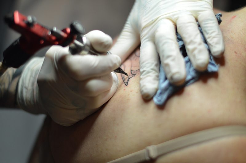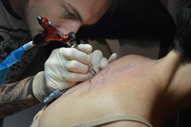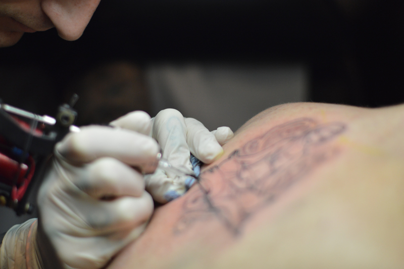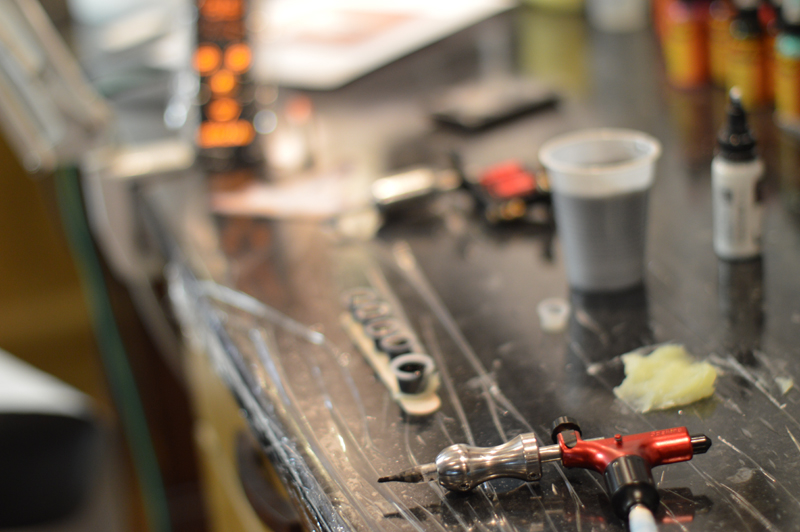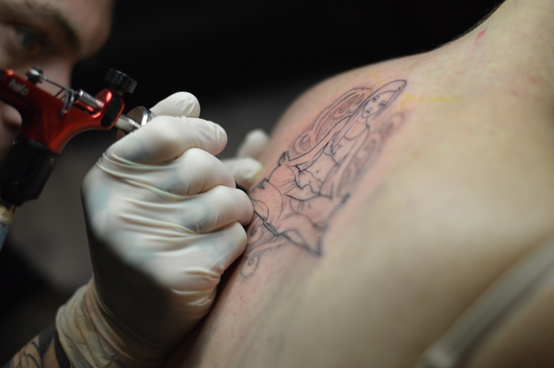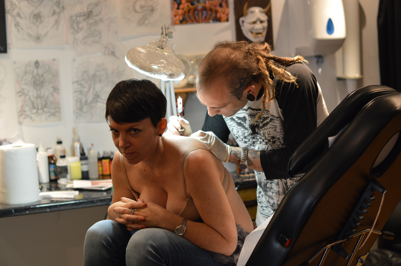 We arrived in Lincoln early in the morning of the appointment, parked at our hotel and walked along the high street using a map to find The Tattooed Arms, which ended up being super easy to find. We were greeted by Alex and his team before sitting down to wait for him to get everything set up. There were a few people already preparing for tattoos and some sitting reading magazines. After we’d admired the studio (it’s heavily influenced by pirates – pretty cool, actually), we skimmed through some of the magazines with mouths wide open – OMG, have you heard about extreme body modification? It’s unbelievable. Google it – you’ll be shocked at how far some people will go.
