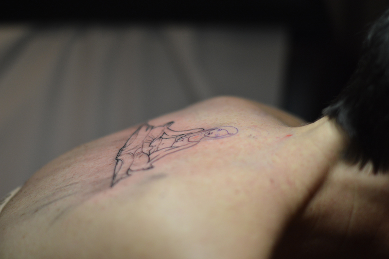 But back to my tattoo. I thought I would be nervous, but the nerves never really kicked in. Probably because I had a feeling I was in really good hands. I was right, of course. Alex made me feel immediately at ease. I wasn’t even that bothered about revealing my lovely flesh-coloured bra to everyone (!). The first thing Alex did was show me the stencil he’d done. I loved it! He very carefully placed it on my upper back but had to remove it because Michael thought it was too high.