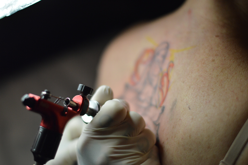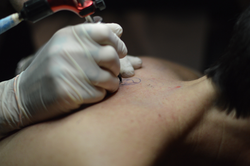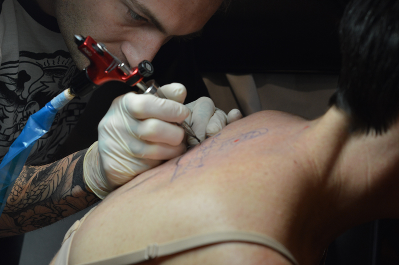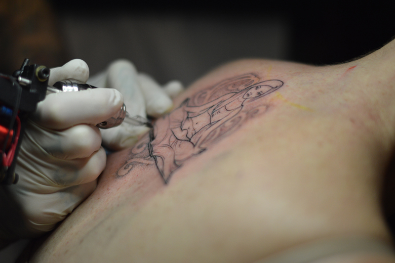 Once we’d got the right position, I sat down and readied myself for the intense pain but it never really came. Yes it hurt a bit, but it was nothing like I’d expected. Some parts of the body are much more painful (the back isn’t really one of them), and I even found when he was outlining the image, that some sections of my back hurt more than others. After a couple of hours, it was my lower back (from sitting forwards) that hurt more than anything! But what hurt the most was when he wiped away the excess ink each time – after a few hours, that cloth started to feel like sandpaper! Ouch! But it’s not that bad really. It’s seriously worth it in the end. Michael was really fed up by the end of it though, because the music that was playing is so not his thing lol!