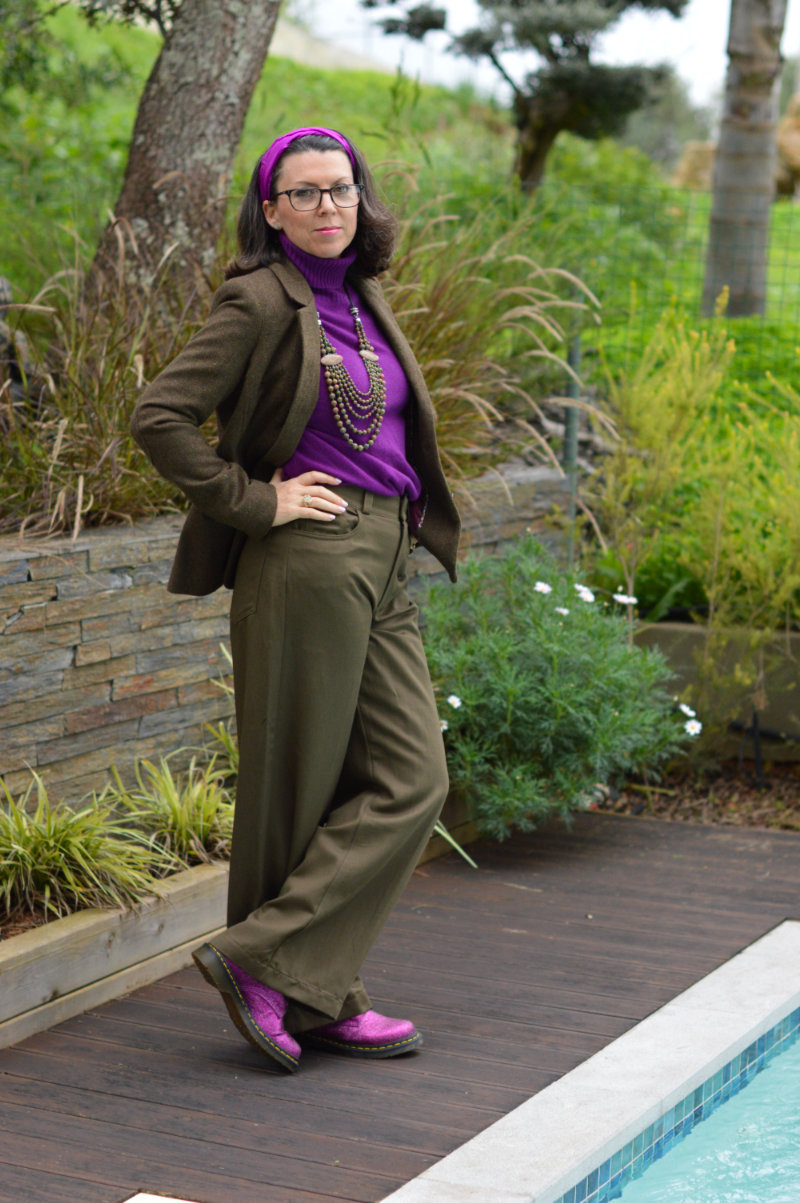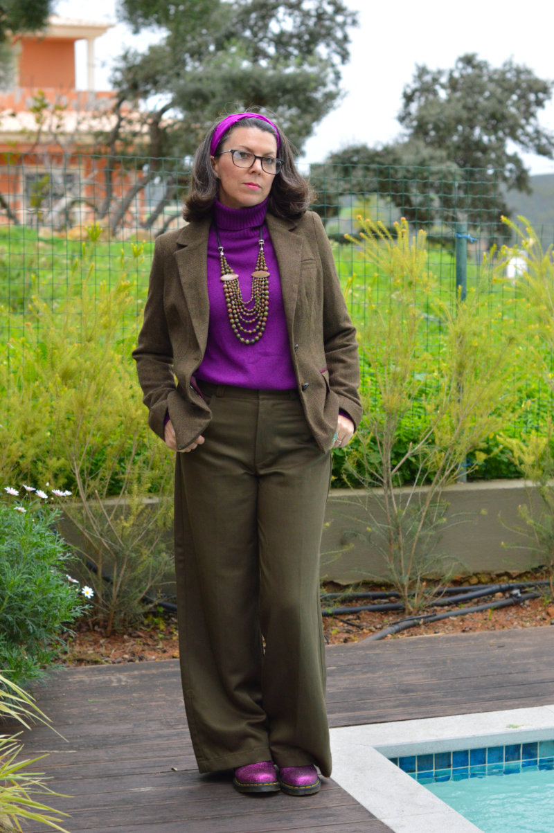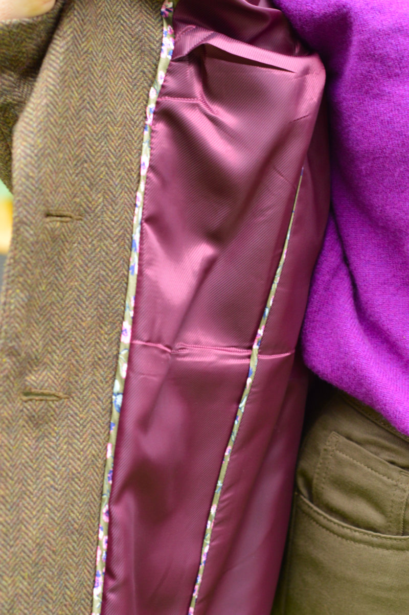 I do, however, own this fabulous tweed jacket that I bought over a year ago from Sainbury’s (a UK supermarket which often has some gorgeous items in its’ TU range). If memory serves me correctly, it cost less than £25 which isn’t very much for a jacket of this quality. One thing that appealed to me is the lining, which is a luxurious pinky-purple satin, not to mention the khaki green of the jacket itself (you know how much I love khaki lol!). Purple (or pink) and green is a particular favourite colour combination of mine, so it seemed only apt that I should wear the tweed jacket with a pinky-purple jumper and khaki trousers. This has now become one of my favourite outfits! I just love it.