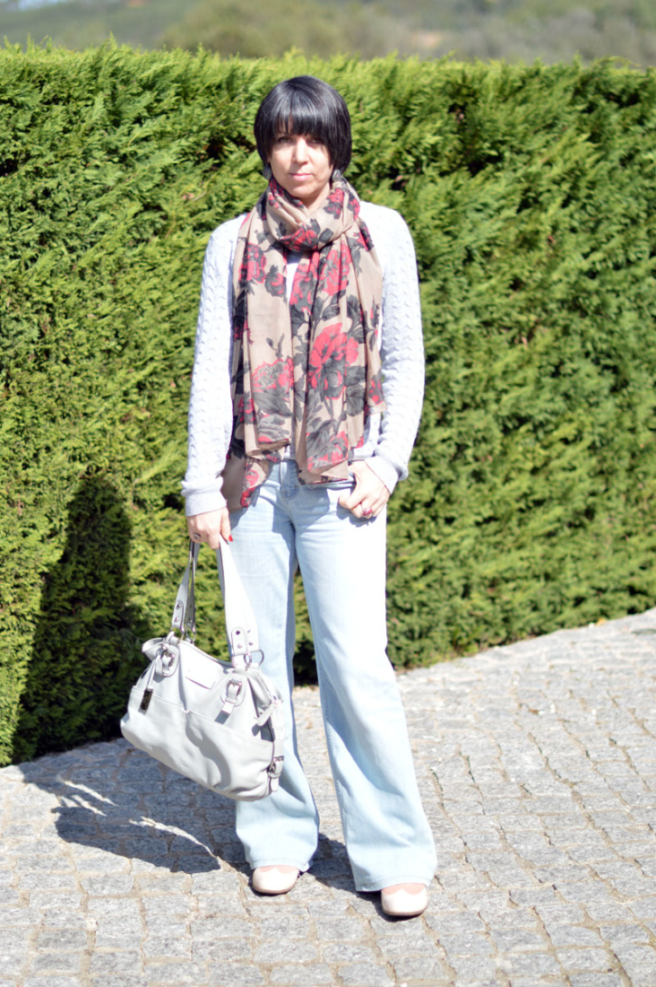 An outfit that I consider to be the epitome of chic is wide legged trousers with brogues, which got me thinking, why not wide-legged jeans with brogues? Hm? So last week I thought I’d try my favourite pink brogues with my favourite soft wide-legged jeans. A girlie cardigan which is pulled in at the waist and a grey and pink scarf completed the look.